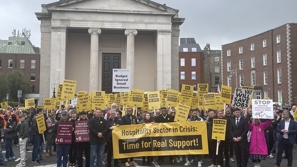 Bhailigh na céadta duine ó earnáil an fháilteachais, na turasóireachta, miondíola agus cúraim leanaí chomh maith le húinéirí gnó le chéile i mBaile Átha Cliath inniu agus iad i mbun agóidíochta maidir le costaisí arda agus easpa cúnaimh ón Rialtas.