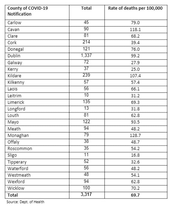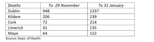 Figures for Covid-19 deaths, and the rate per 100,000 of the population for all counties in the State, up to midnight on 31 January show that Mayo, with 122 deaths, was also among the counties with the highest death rate.