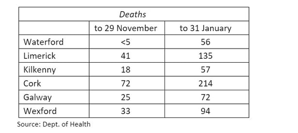 Cork saw a large increase in notified deaths: 214 in total, with 72 of those occurring before 30 November.