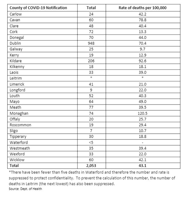 Figures released by the Department of Health to Nuacht RTÉ show that Monaghan and Cavan have the two highest rates of death associated with Covid-19 in the State.