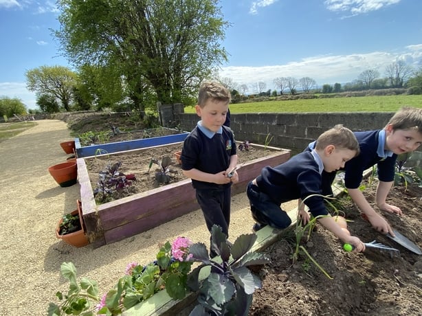 The junior infants play happily in the vegetable patches where outdoor movement is being nurtured and seeds planted for future well being.