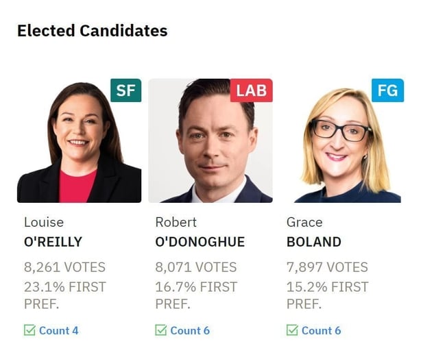 In the end, both she and Mr O’Donoghue passed the quota, with the race concluding after six counts.