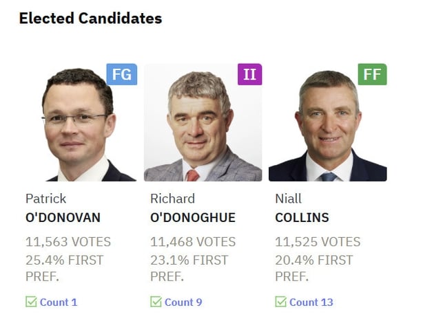 It was not until the tenth count that Independent Ireland candidate Richard O'Donoghue was elected, retaining his seat after securing 11,468 votes.