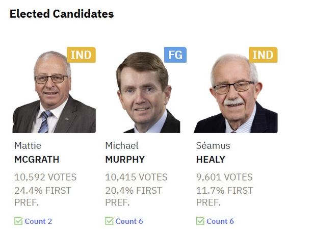 Independent TD Mattie McGrath was the first candidate to be elected after he passed the quota of 10,270 votes.