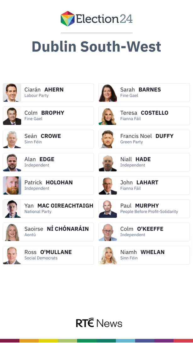 Mr Crowe topped the poll, but his vote was well down on his 2020 figure - it should be noted though that this constituency underwent significant boundary changes in the interim - trading around 10,000 votes in the Templeogue/Terenure for the same amount in Tallaght/Fettercairn.