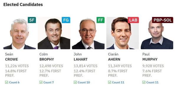 Four of the five outgoing TDs were re-elected - Sinn Féin's Seán Crowe, Fine Gael's Colm Brophy, Fianna Fáil's John Lahart, and People Before Profit-Solidarity's Paul Murphy.
