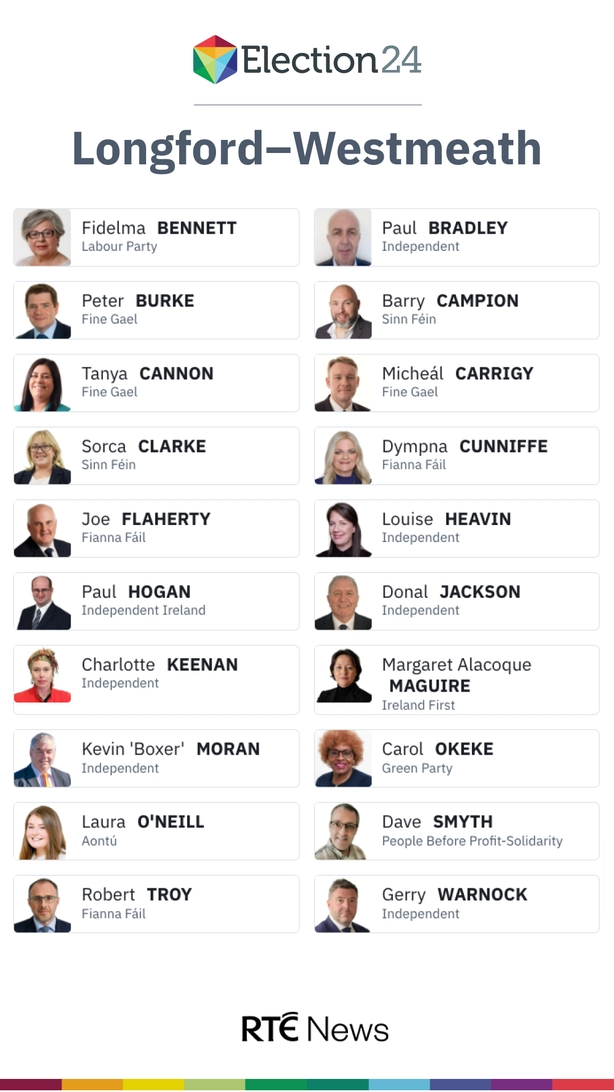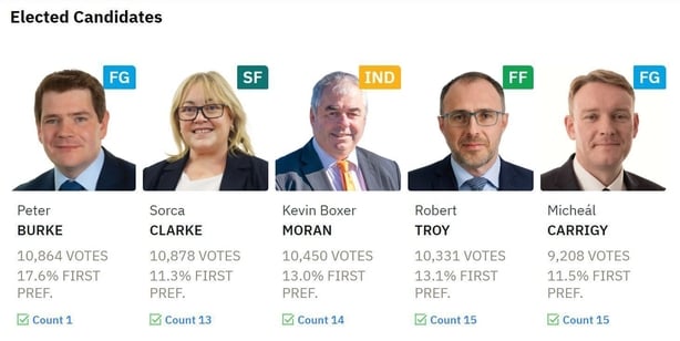 The five newly elected TDs are Fine Gael's Peter Burke, Sinn Féin's Sorca Clarke, Independent Kevin 'Boxer' Moran, Fianna Fáil's Robert Troy and Fine Gael's Micheál Carrigy.