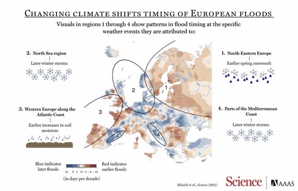 In their paper, published in the journal Science, the research team found that in western and northeastern parts of Europe, rivers are reaching peak flooding earlier in the spring.