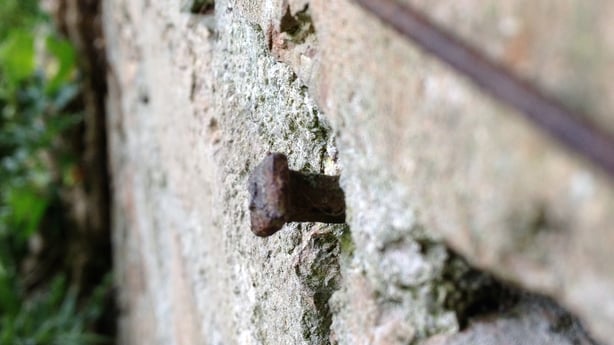 Rusty old nails with old forged vintage square heads on them, remnants from a different age with long chamfering rusty tails, and slowly but surely as Mary asks us to move in and examine them more closely these nails dot their way all the way down the wall - none of them at regular or calculated intervals - all of them travelling down at varying levels - along the brick and stone walls.