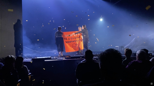 Two protesters climbed onto the stage at London's Theatre Royal during performance of William Shakespeare's 'The Tempest', launching a confetti cannon, according to footage posted on social media.