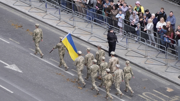 Ukrainian armed forces also took part, carrying their nation's blue and yellow flag, in a gesture that underlined Britain's continued support for Ukraine in its war with Russia.
