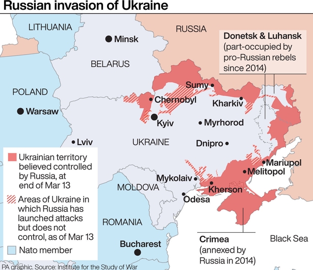Russian forces have been bearing down on the capital Kyiv from the northeast and northwest, but have made little progress so far towards the capital itself, despite heavy fighting that has reduced suburbs on the outskirts to rubble.