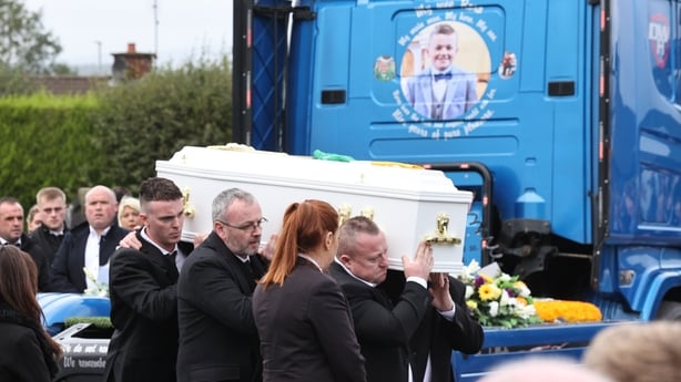 Ronan’s white coffin arrived at the church on the back of a lorry cab with his football jersey on top.