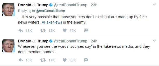 "Whenever you see the words 'sources say' in the fake news media, and they don't mention names," Mr Trump wrote, "it is very possible that those sources don't exist but are made up by fakenews writers. #FakeNews is the enemy!"