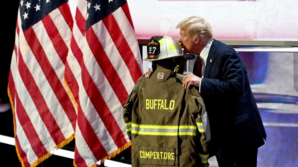 With photos of a bloodied Mr Trump showing on screens behind him, he praised the Secret Service agents that rushed to his side and paid tribute to the volunteer firefighter who was killed, Corey Comperatore, kissing his fire helmet.