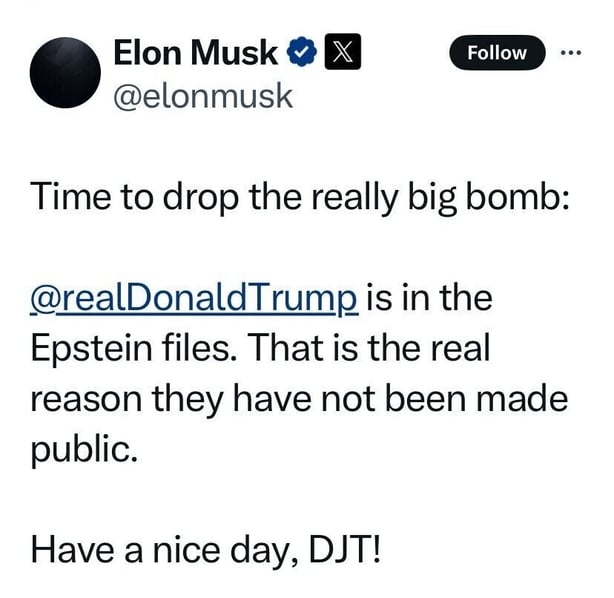 "Time to drop the really big bomb: (Mr Trump) is in the Epstein files," Mr Musk posted on his social media platform, X, formerly Twitter.