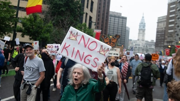 In a sign of the widespread nature of the protests, small groups of mostly middle-aged and elderly people holding signs and protesting Mr Trump were scattered at intersections across affluent northwest Washington and its Maryland suburbs - urging motorists to honk their horns in support and holding signs saying things including "Honor Troops (not Trump)" and "No Kings" and "No Kings since 1776".