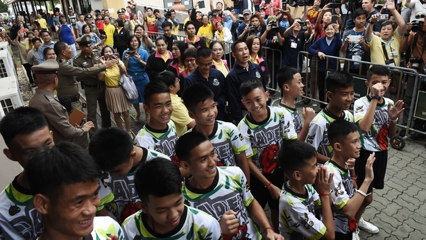 Doctors, relatives and friends, some in yellow traditional garb, greeted the boys, aged 11 to 16, and their 25-year-old coach, who wore T-shirts emblazoned with a red graphic of a wild boar and carried footballs they kicked gently on the set.