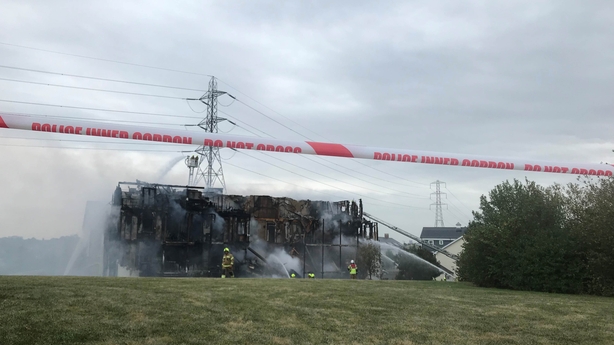 A charred shell is almost all that remains of the partially-collapsed development in Worcester Park, Sutton, as firefighters continue to work at the scene.