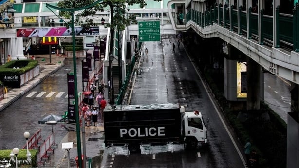 A few metres away, hundreds of activists blocked the road behind a makeshift barrier, calling for the riot police to "get out!" and singing the Thai national anthem.