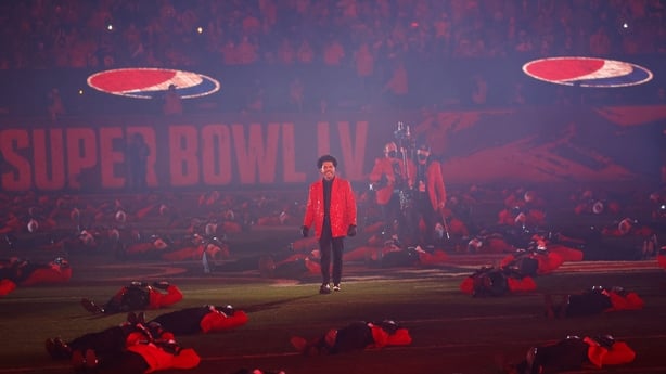 He joined a small army of backing dancers - all wearing the same red jacket as him but with bandages on their faces in line with the aesthetic for his After Hours album - on the field to perform 2020 hit Blinding Lights.
