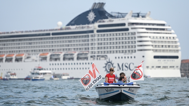 With the MSC Orchestra looming over Saint Mark's square, demonstrators in small motorboats waved banners reading "no to cruise ships".