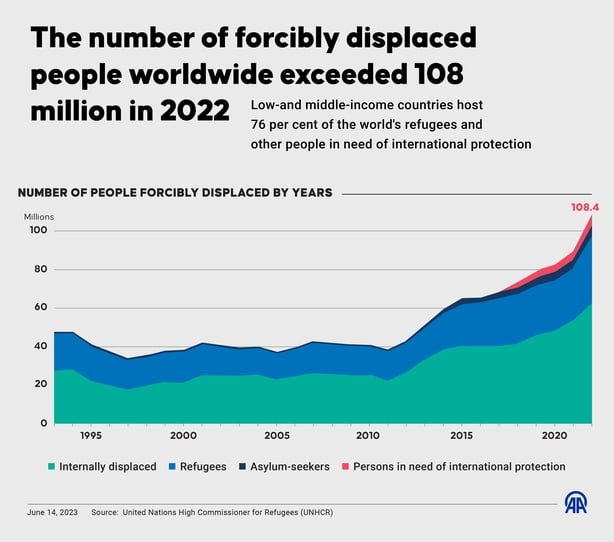 Of the 2022 global total, 35.3 million were refugees who fled abroad, with 62.5 million being internally displaced.