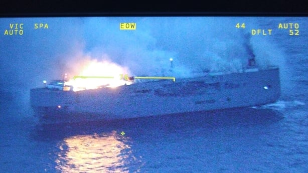 Salvage vessels are on the scene trying to put out the blaze and prevent the ship from sinking, the coastguard said.