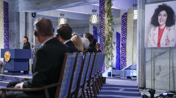 Imprisoned Nobel Peace Prize winner Narges Mohammadi denounced the "tyrannical and anti-women religious" government of Iran, in a speech delivered by her children who accepted the award.