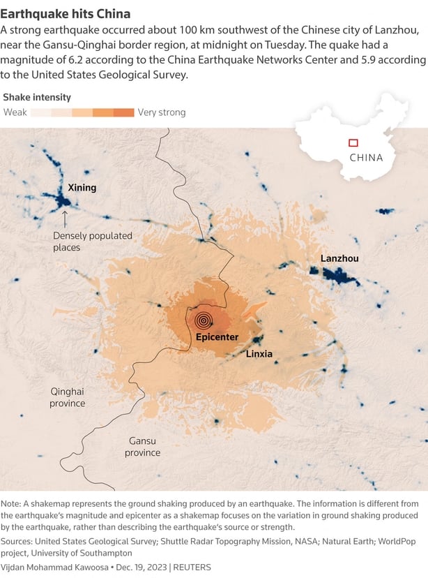 China's state news agency Xinhua reported the magnitude as 6.2 and said the shaking was felt as far away as the major city of Xi'an, about 570km away.
