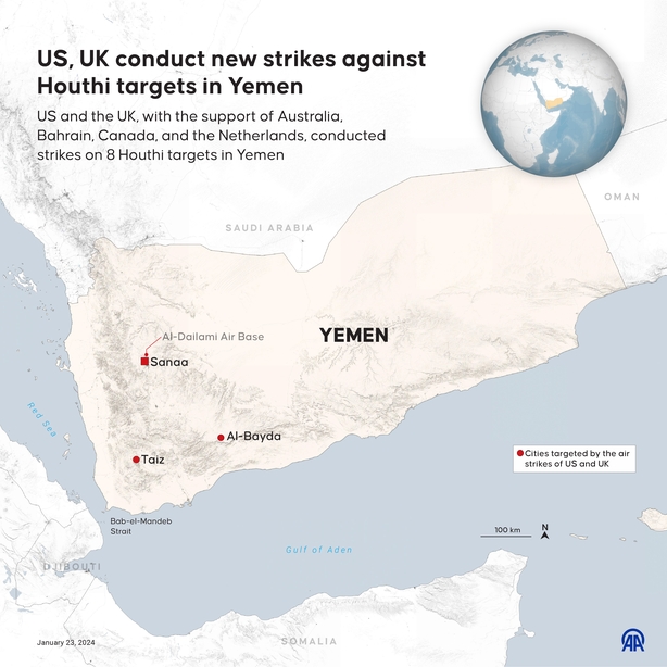 The latest US-UK strikes were against "eight Houthi targets in Yemen in response to the Houthis' continued attacks against international and commercial shipping as well as naval vessels transiting the Red Sea," Washington and London said in a joint statement with other countries that supported the military action.