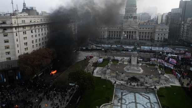 Inside Congress, senators were debating what remains of Mr Milei's flagship reform bill - rejected in its original form and approved with major changes by the lower house Chamber of Deputies in April.