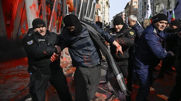 The anti-government protesters, chanting "Resignation" and "No to the Euro", threw red paint, firecrackers and Molotov cocktails at the EU building in the capital Sofia, setting the front door on fire before the police pushed them away.