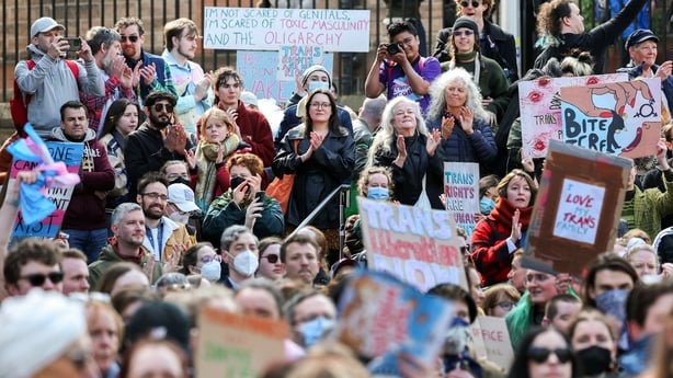 Outside the UK parliament in London, activists, protesters, trade unions and community groups waved flags and held up banners with slogans such as "trans women are women!" and "trans rights are human rights".