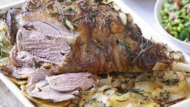 To serve, carve the lamb into slices and arrange on warmed serving plates with the boulangère