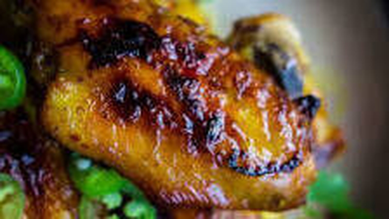 1 Mix together the soy, chilli sauce and lime juice in a small pan. Pour half into a shallow dish and stir in the garam masala. Add the winglets and mix until evenly coated. Set aside for 1 hour or cover with clingfilm and chill for up to two days.