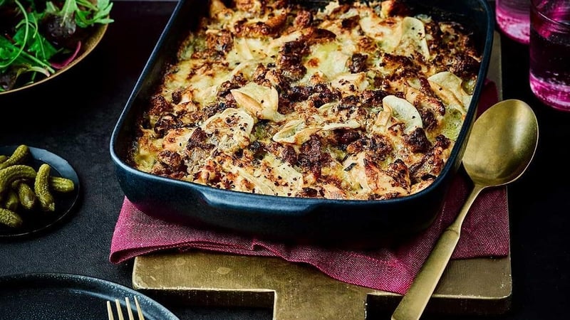 Use the leftovers of a sourdough loaf to make a delicious cheesy, golden topping. Serve with a salad or any green vegetable. The filling is lovely and creamy without having to go to the trouble of making a white sauce – perfect for a cold winter evening.