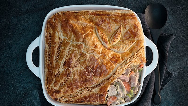 4 Roll out the puff pastry on a lightly floured board until it’s the thickness of a €1 coin and large enough to easily cover the pie dish. Brush the edge of the pie dish with egg wash, then cover with the pastry. Use a sharp knife to trim down as necessary and use a fork to lightly press around the edge to crimp it. Stamp or cut out leaves from the pastry leftovers and use to decorate the pie if liked. Brush with more egg wash and make a small hole in the middle to allow the steam to escape.