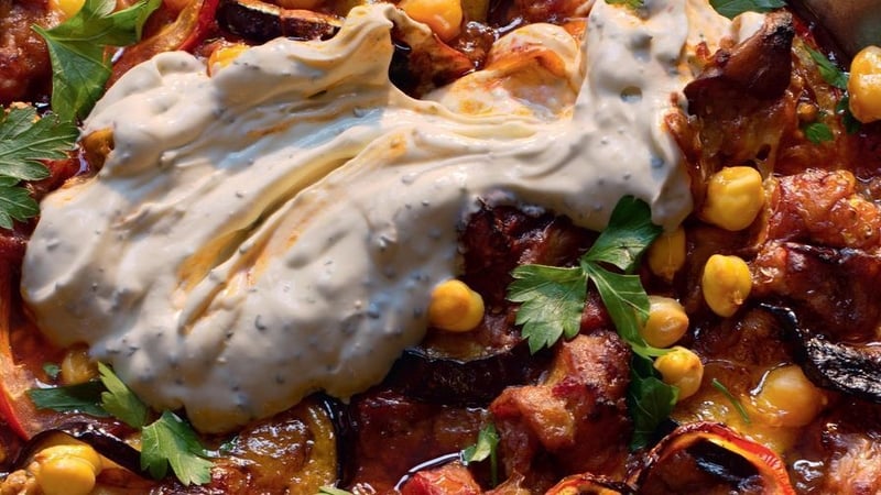 Meanwhile, preheat the oven to 200°c (400°F/gas mark 6). once the sauce is done, cover with the chickpeas, sliced ripe tomatoes and finally the sautéed aubergine slices, then drizzle with a little extra oil. Bake in the preheated oven for 20 minutes, until bubbling and golden on top. to make the dressing, stir together the yoghurt, tahini and lemon juice with the water and season with za’atar to taste.