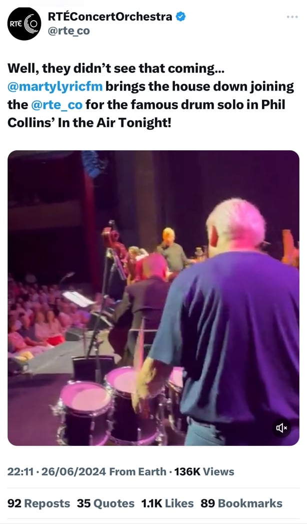 The RTÉ Concert Orchestra posted a video of the performance on X (formerly Twitter) which quickly gained a lot of attention, with followers commenting on the presenter's ability to play. One follower asked, "Is there no end to this man's talents?" while others remarked on his perfect timing.