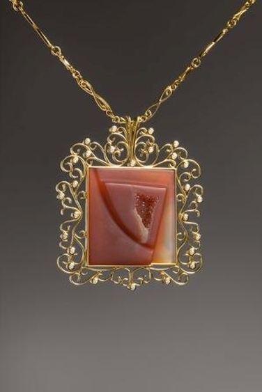Pictured are: above, Anne Mulrooney and Katy West; a chair by Laura Mays; above left, Vincent Woods, Rudolf Helztel and Dave Wilson; above right, Christopher Heltzel and Maeve Lynch; left, a Rudolf Heltzel hand made 18ct gold pendant set with sculpted carnelian and diamonds on a hand made 18ct gold chain.