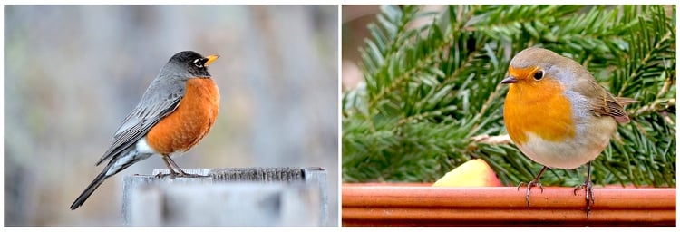 Left: an American Robin (photo: Tiffany Fugere / Pixabay); right: a European Robin (photo: Christiane / Pixabay)