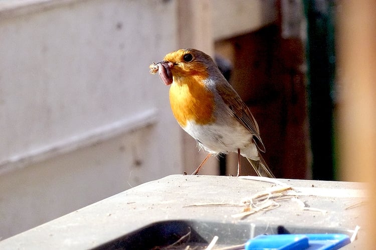 Robins are ground feeders. They eat mostly insects and earthworms. A great opportunist, the Robin will approach a gardener to cash in on the earth worms and insect larvae turned up by the spade. They can become extremely tame by repeated offers of food. Some will feed from the hand.