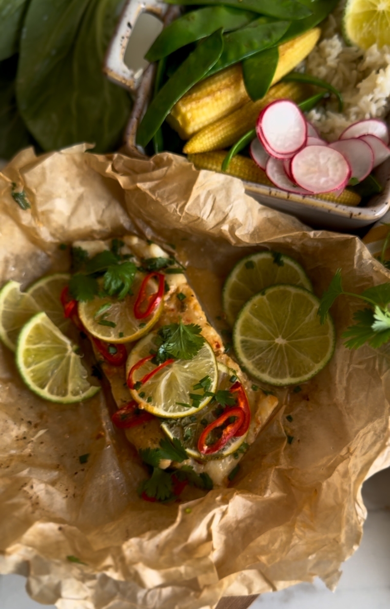 2. Cook for 12–15 minutes depending on the thickness of the fillets. The cod should be opaque and flake easily with a fork To Serve: Carefully open the parcels (be careful of the steam). Serve directly in the parcel or plate it up with steamed rice, couscous, or salad. Garnish with fresh coriander and an extra wedge/slices of lime.