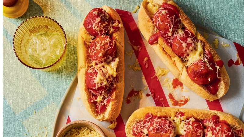 3. Heat the tomato sauce and add the cooked turkey meatballs. Put 3 meatballs and some sauce on each roll, coat in sauce, and top with grated cheese