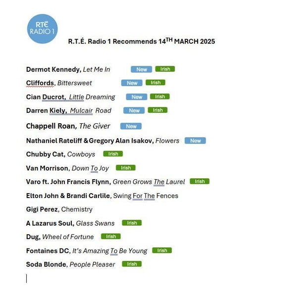 RTE RADIO 1 RECOMMENDS 14TH MARCH 2025 Published • 12:06 • Friday, 14 Mar 2025 RTE RADIO 1 ALBUM OF THE WEEK 14th MARCH 2025