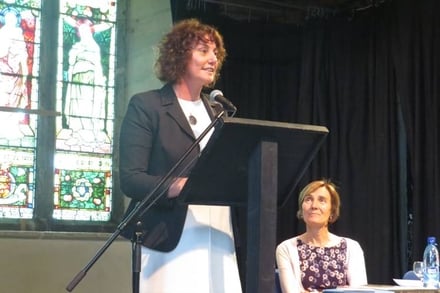 Enda Wyley (standing) and Jane Clarke take part in a poetry reading at Listowel Writers' Week 2015