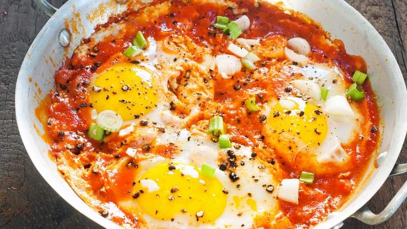 Use a spoon to make small wells in the tomato stew, then crack in the eggs so they poach in the thick tomato sauce– try to crack them in as quickly as you can so they all get to cook for roughly the same amount of time. Put the lid on and let the eggs cook for around 3 to 4 minutes, or until cooked to your liking.