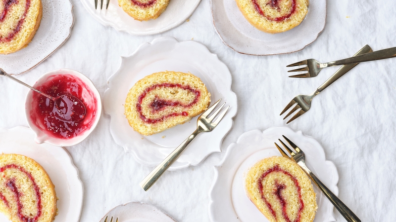 While it’s baking, lay a clean damp tea towel on your work surface. Put a piece of non-stick baking paper that’s bigger than the Swiss roll tin on top of the towel, then sprinkle some extra caster sugar all over the paper. Give the jam a good stir to make it more spreadable – you can heat it ever so slightly in a saucepan or in the microwave if required.