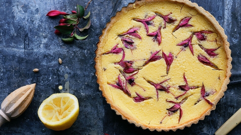 Give the filling mixture a good stir to distribute the zest and pour half of the mixture into the tart case, arrange the fuchsia flowers into the mix and then carefully pour in the remainder of the filling. You may find this last step easier to do at the oven.